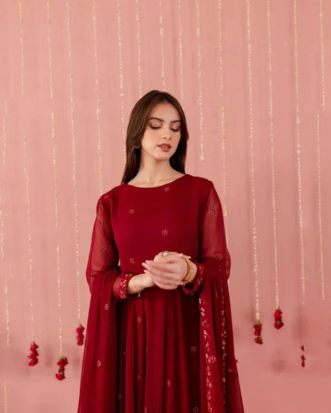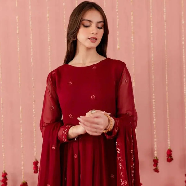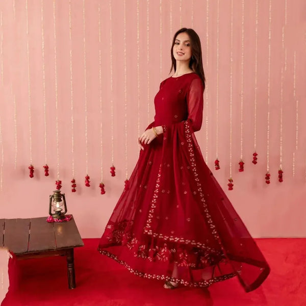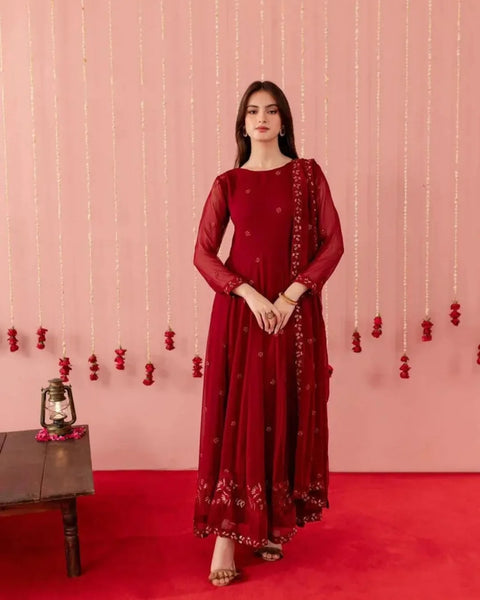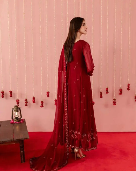 This 3-piece ensemble features rich embroidered work on chiffon, paired with a beautifully embroidered chiffon dupatta and a smooth raw silk trouser. Designed to give a refined, graceful, and stylish appearance, perfect for formal and semi-formal wear.