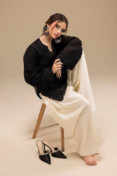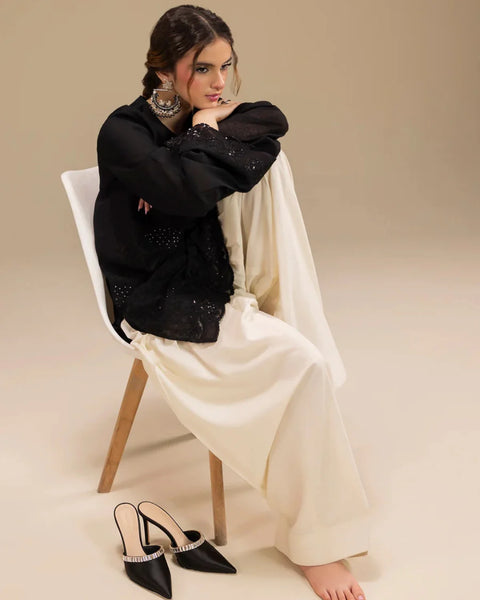 The beautifully embroidered shirt is finished with delicate lace details and refined sequin accents, paired with a classic white farshi shalwar for a graceful and regal appearance. An airy organza dupatta, adorned with fine embroidery, completes the look-perfect for daytime celebrations, mehndi events, and festive